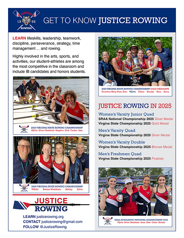 Come and visit with the Justice Crew Rowing Team this Saturday at Beach 4 (6100 Beachway Drive) from the hours of 12 - 4 pm. Learn more about this energetic sport and our local team and chat with students and coaches. There may even be an opportunity to try out the Lake Barcroft Skull!